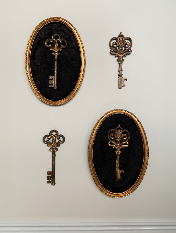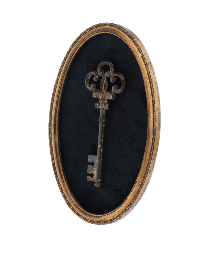 Élégante et mystérieuse, cette clé dorée est mise en valeur dans un cadre ovale en velours noir. Un contraste raffiné qui apporte une touche de caractère et de charme à votre décoration murale. Dimensions : 21.4x31.2cm