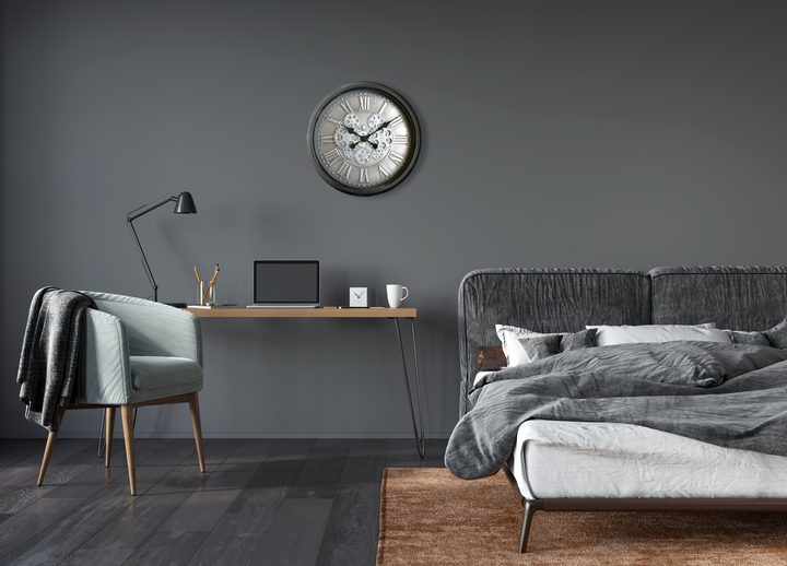 Avec ses engrenages mobiles, cette horloge apportera une touche d'originalité à votre mur. En métal et verre. A accrocher au mur, diamètre 52,5cm. Mécanismes mobiles.Cette horloge fonctionne avec 1 pile AA. Pour faire tourner le mécanisme 3 piles AA supplémentaires sont nécessaires (Piles non incluses).