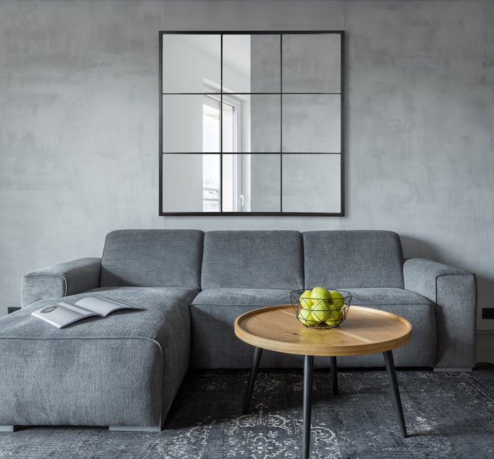 This metal window effect mirror has 9 views. Its large size brings an effect of depth to your room.