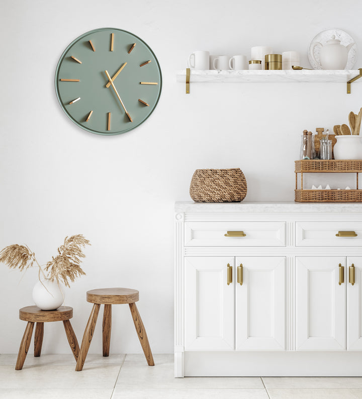 Cette jolie horloge, en métal couleur sauge, suit parfaitement la tendance. Son cadran doré en relief apporte du cachet et une touche chic. A accrocher au mur. Diamètre: 51cm. Cette horloge fonctionne avec 1 pile AA. (Pile non incluse).