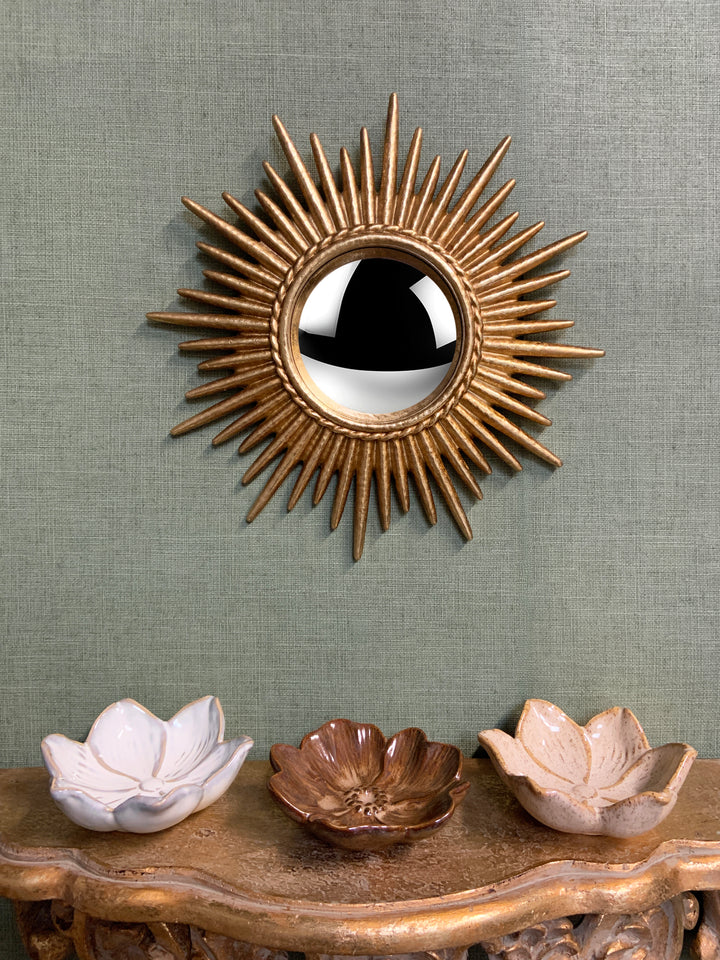 Que vous l'accrochiez dans votre entrée, votre salon ou votre chambre à coucher, ce miroir soleil convexe doré offre une réflexion déformée et fascinante qui ajoute de la profondeur et du caractère à votre décor. Diamètre : 26cm