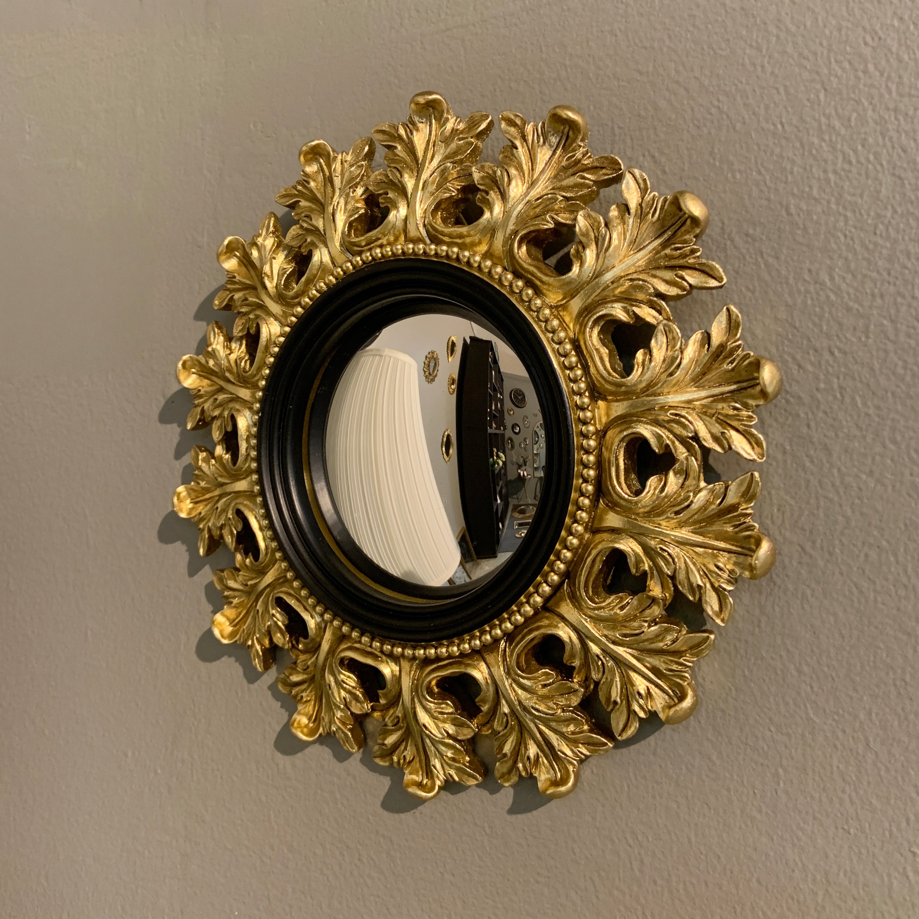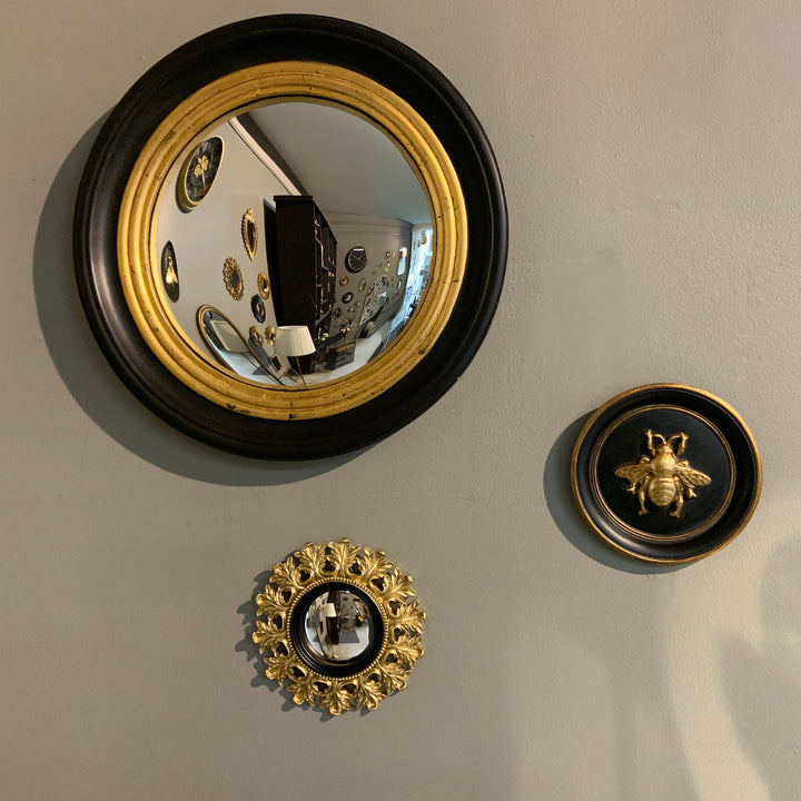 Que vous l'accrochiez dans votre entrée, votre salon ou votre chambre à coucher, ce miroir convexe noir et doré offre une réflexion déformée et fascinante qui ajoute de la profondeur et du caractère à votre décor. Diamètre : 20.5cm