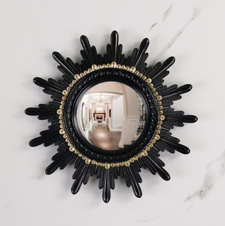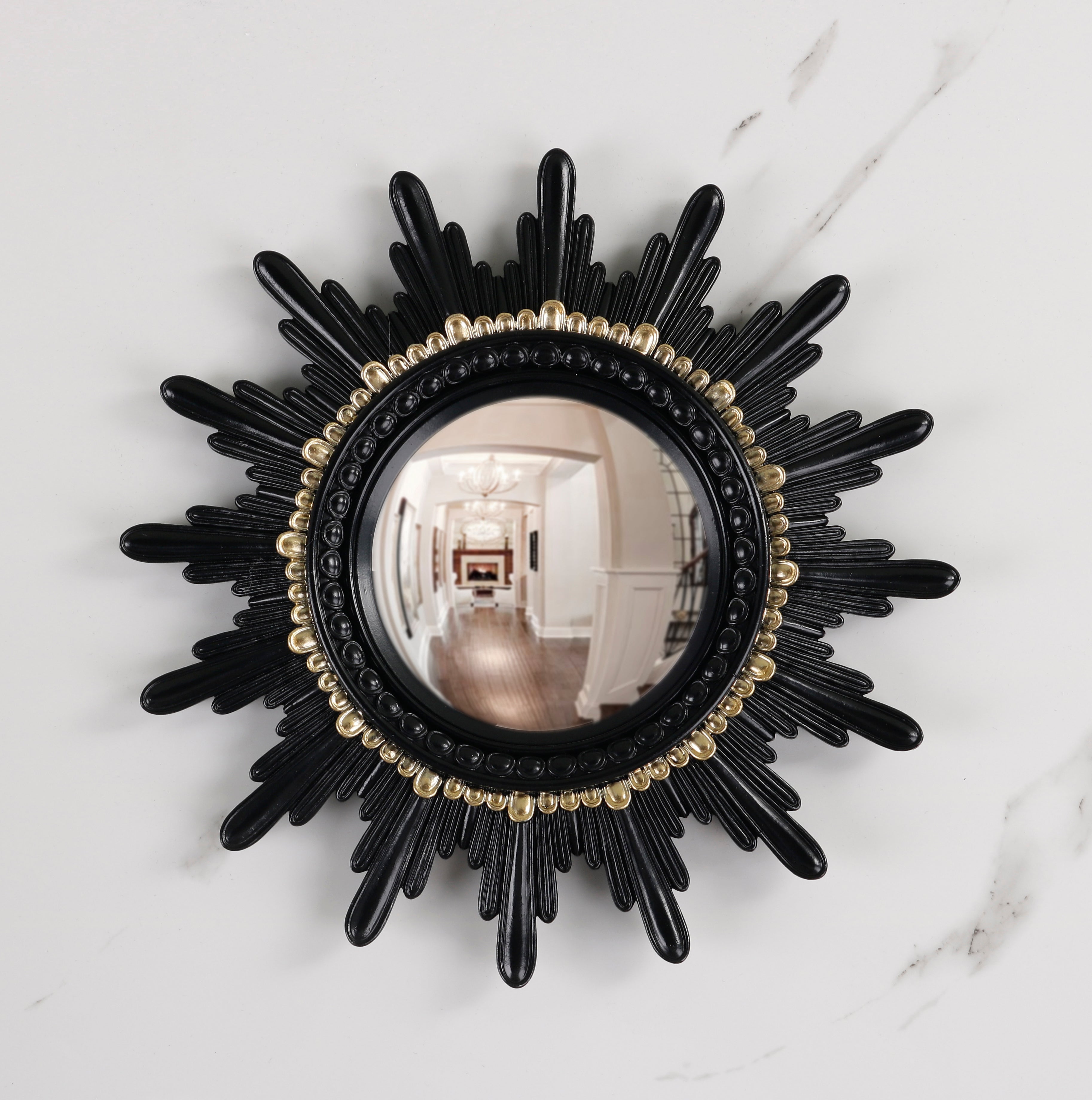 Sublimez vos murs avec ce miroir soleil convexe noir et doré de 20,3 cm. Son design rayonnant associé au miroir bombé crée un jeu de reflets unique et captivant. Idéal pour ajouter une touche vintage et lumineuse à votre décoration intérieure.