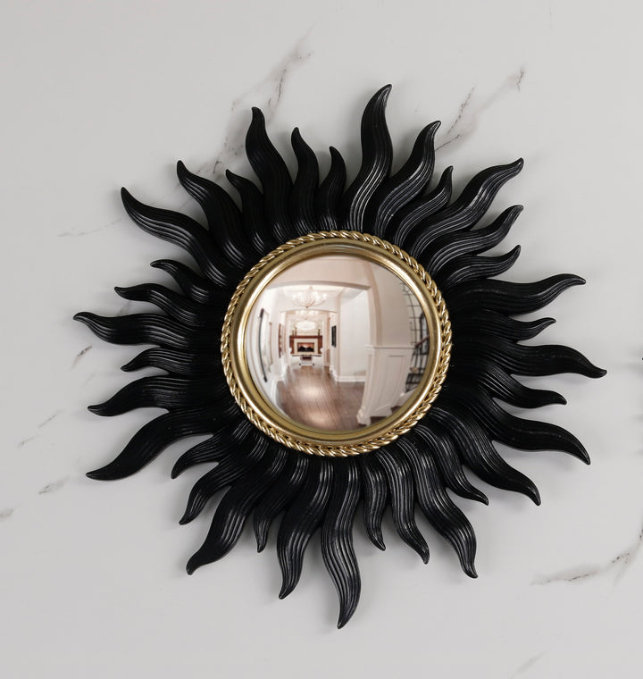 Sublimez vos murs avec ce miroir soleil convexe noir et doré de 26 cm. Son design rayonnant associé au miroir bombé crée un jeu de reflets unique et captivant. Idéal pour ajouter une touche vintage et lumineuse à votre décoration intérieure.