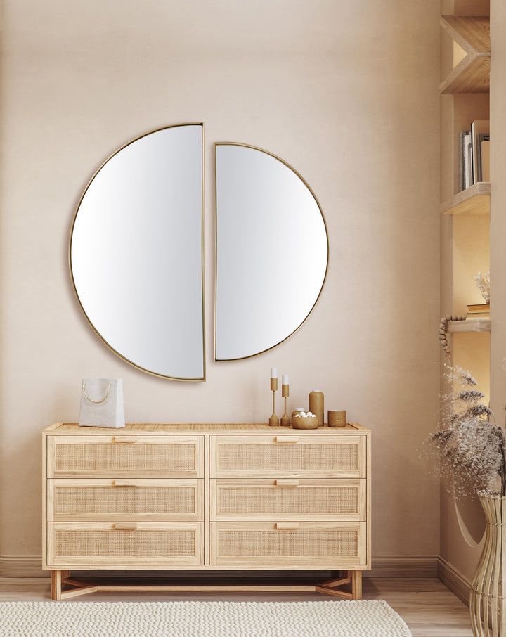 Miroir intemporel demi cercle. Avec sa moulure fine et discrète, ce miroir s'adapte à tous les styles. A accrocher au mur verticalement ou horizontalement. Dimensions: 50x100cm.