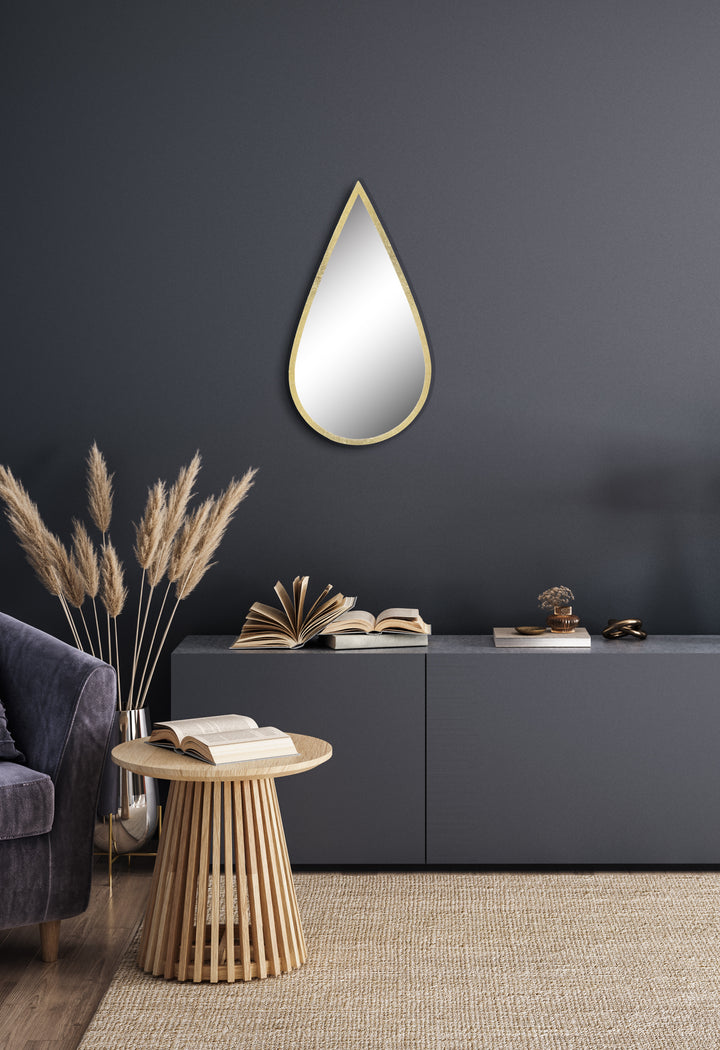 Joli miroir décoration en forme de goutte d'eau. Il apportera une touche d'élégance à votre intérieur. Contour en métal doré. Dimensions: 24.5x44.5xm. A accrocher (fixation au dos).